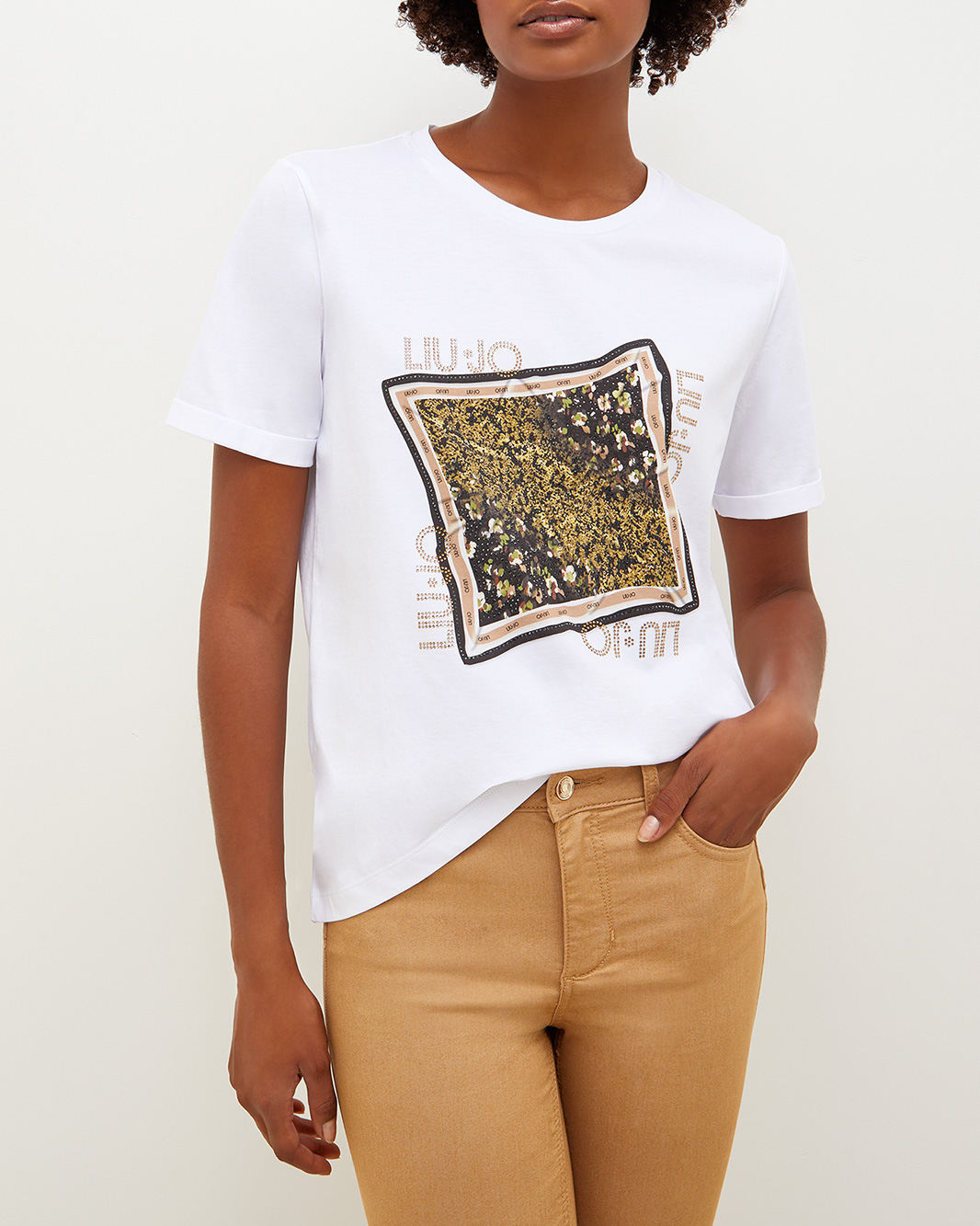 T Shirt Bianca In Puro Cotone Con Stampa Foulard Frontale E Logo In Strass